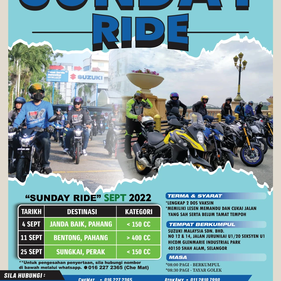 Suzuki Weekend Ride 3/8/2022 admin February 20, 2026 Suzuki Sunday Ride!! Date : 7th August 2022, Sunday Destination : Tanjung Malim, Perak Starting point : Suzuki Malaysia Sdn